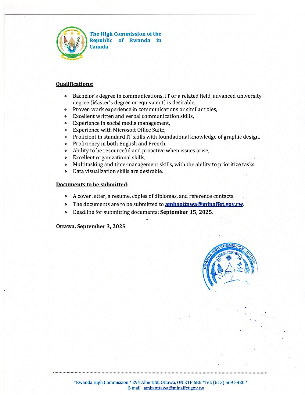 We are looking for a highly motivated professional with strong communication and technical skills, capable of managing digital platforms, designing outreach strategies, and providing IT support. The successful candidate will play a vital role in connecting the High Commission with Rwandans in its jurisdiction and strengthening bilateral relations.