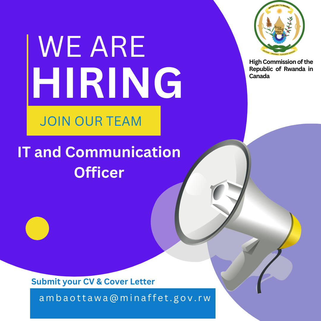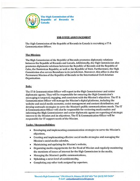 The High Commission of the Republic of Rwanda in Canada is pleased to announce a career opportunity for an IT and Communication Officer. This role presents a unique opportunity to contribute to Rwanda’s diplomatic presence in Canada, Cuba, the Dominican Republic, and Haiti, as well as ICAO, while supporting community engagement and promoting Rwanda’s international image.